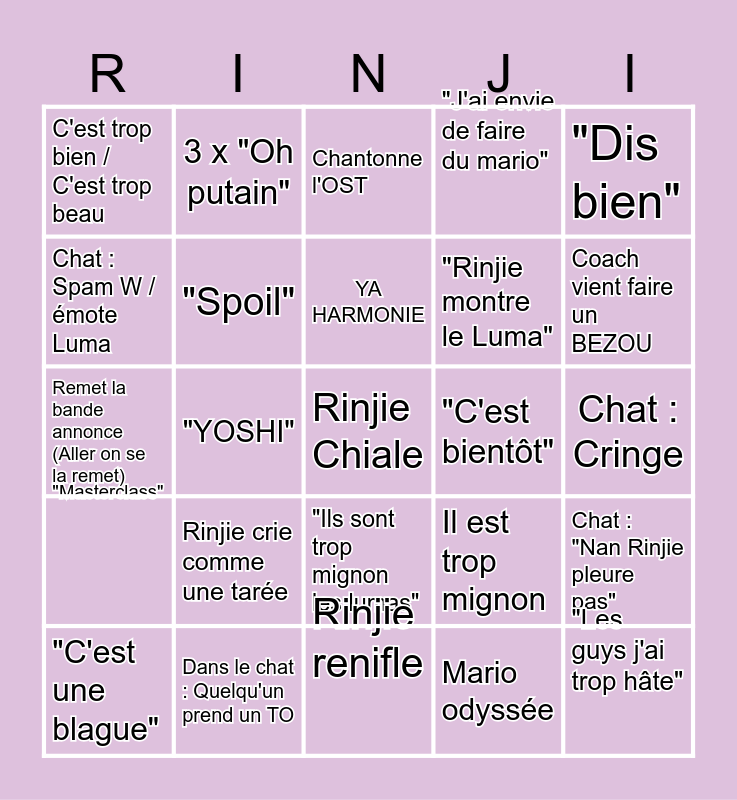 This bingo card has a free space and 24 words: Rinjie crie comme une tarée, Dans le chat : Quelqu'un prend un TO, YA HARMONIE, "C'est une blague", "Dis bien", C'est trop bien / C'est trop beau, Chat : Spam W / émote Luma, 3 x "Oh putain", "C'est bientôt", "Ils sont trop mignon les lumas", "Rinjie montre le Luma", Remet la bande annonce (Aller on se la remet), Il est trop mignon, Chat : "Nan Rinjie pleure pas", "Spoil", Mario odyssée, Chat : Cringe, Chantonne l'OST, Coach vient faire un BEZOU, "YOSHI", "Les guys j'ai trop hâte", "Masterclass", "J'ai envie de faire du mario" and Rinjie renifle.