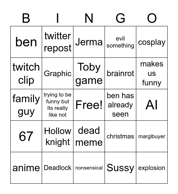 This bingo card has a free space and 24 words: Hollow knight, Deadlock, Toby game, anime, cosplay, ben, twitch clip, twitter repost, ben has already seen, dead meme, brainrot, family guy, christmas, marglbuyer, Graphic, Sussy, AI, Jerma, makes us funny, trying to be funny but its really like not, explosion, 67, evil something and nonsensical.