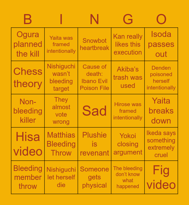 This bingo card has a free space and 24 words: Matthias Bleeding Throw, Nishiguchi let herself die, Cause of death: Ibano Evil Poison File, Bleeding member throw, Isoda passes out, Ogura planned the kill, Chess theory, Yaita was framed intentionally, Hirose was framed intentionally, Plushie is revenant, Akiba’s trash was used, Non-bleeding killer, Yokoi closing argument, Ikeda says something extremely cruel, Nishiguchi wasn’t bleeding target, The bleeding don’t know what happened, Yaita breaks down, Snowbot heartbreak, Denden poisoned herself intentionally, They almost vote wrong, Fig video, Hisa video, Kan really likes this execution and Someone gets physical.