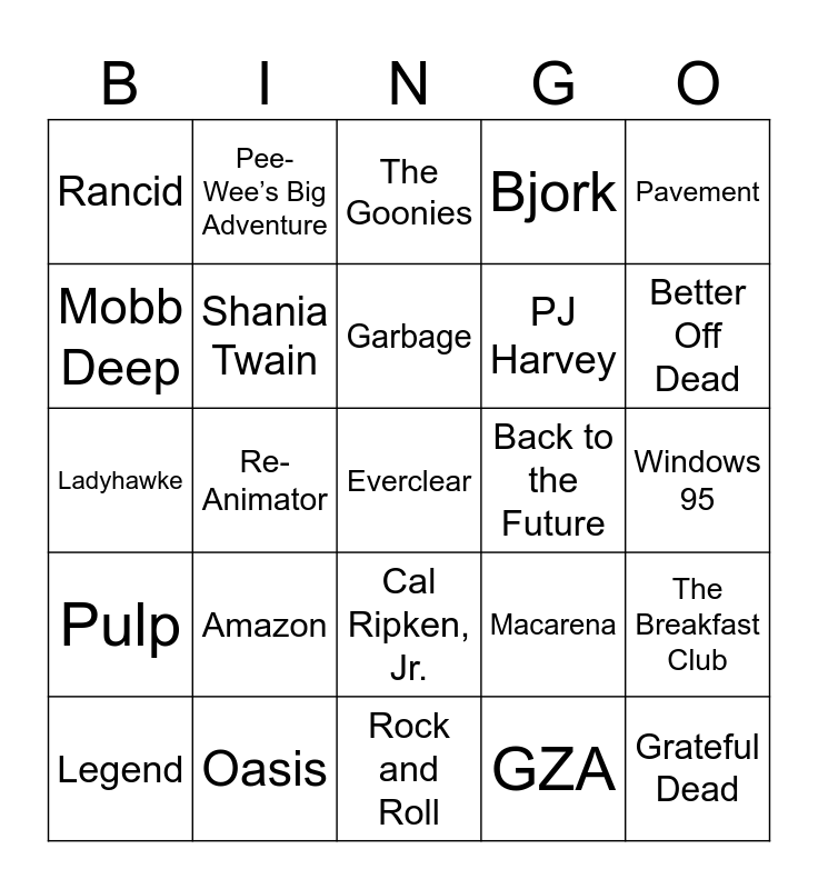 This bingo card has 60 words: Radiohead, Oasis, The Smashing Pumpkins, Pulp, GZA, Alanis Morissette, Shania Twain, Raekwon, PJ Harvey, Tricky, Bjork, Jawbreaker, Mobb Deep, Yo La Tengo, Blur, Rancid, Everclear, Pavement, Foo Fighters, Garbage, Back to the Future, The Goonies, Legend, The Breakfast Club, Clue, Weird Science, Explorers, The Return of the Living Dead, Better Off Dead, Commando, Cocoon, Teen Wolf, St. Elmo’s Fire, Return to Oz, Pee-Wee’s Big Adventure, Young Sherlock Holmes, Fright Night, Re-Animator, Spies Like Us, Ladyhawke, Drew Barrymore, Amazon, Windows 95, Pogs, Macarena, Waterfalls, Bronco, Brad Pitt, Hale-Bopp, Cal Ripken, Jr., Rock and Roll, X-Games, DVD, The Human Genome Project, Waterworld, Road Rules, Xena: Warrior Princess, Batman Forever, Grateful Dead and eBay.