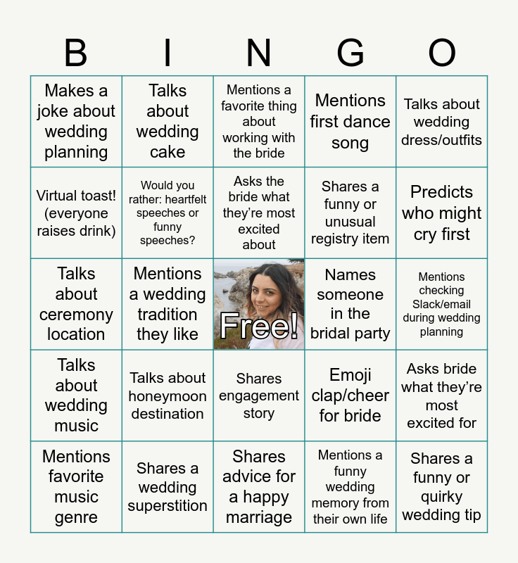 This bingo card has a free space and 24 words: Talks about honeymoon destination, Shares a wedding superstition, Asks the bride what they’re most excited about, Mentions favorite music genre, Talks about wedding dress/outfits, Makes a joke about wedding planning, Virtual toast! (everyone raises drink), Talks about wedding cake, Names someone in the bridal party, Shares engagement story, Shares a funny or unusual registry item, Talks about ceremony location, Emoji clap/cheer for bride, Asks bride what they’re most excited for, Would you rather: heartfelt speeches or funny speeches?, Mentions a funny wedding memory from their own life, Mentions checking Slack/email during wedding planning, Mentions a favorite thing about working with the bride, Predicts who might cry first, Mentions a wedding tradition they like, Shares a funny or quirky wedding tip, Talks about wedding music, Mentions first dance song and Shares advice for a happy marriage.