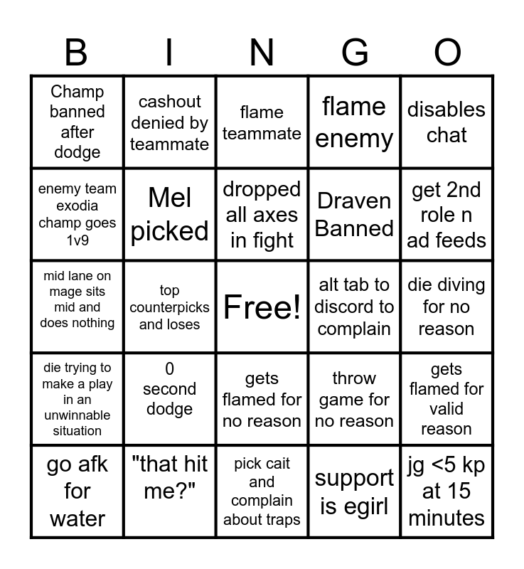 This bingo card has a free space and 24 words: 0 second dodge, "that hit me?", dropped all axes in fight, go afk for water, disables chat, Champ banned after dodge, enemy team exodia champ goes 1v9, cashout denied by teammate, alt tab to discord to complain, gets flamed for no reason, Draven Banned, mid lane on mage sits mid and does nothing, throw game for no reason, gets flamed for valid reason, Mel picked, support is egirl, die diving for no reason, flame teammate, get 2nd role n ad feeds, top counterpicks and loses, jg <5 kp at 15 minutes, die trying to make a play in an unwinnable situation, flame enemy and pick cait and complain about traps.