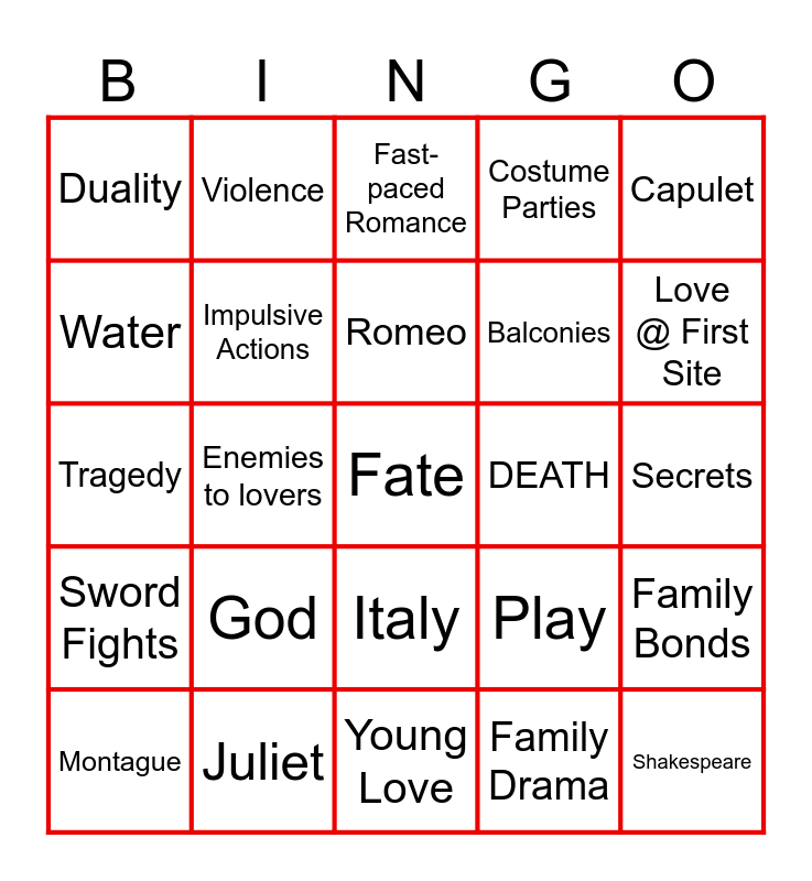 This bingo card has a free space and 24 words: God, Juliet, Romeo, Montague, Capulet, Duality, Water, Violence, DEATH, Italy, Balconies, Tragedy, Play, Family Bonds, Impulsive Actions, Family Drama, Secrets, Fast-paced Romance, Love @ First Site, Enemies to lovers, Shakespeare, Sword Fights, Costume Parties and Young Love.