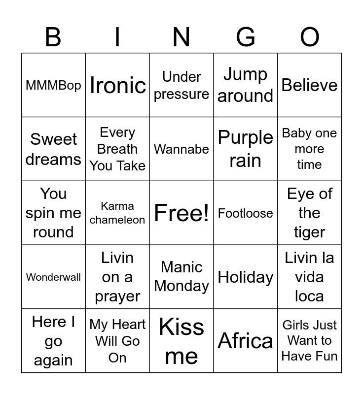 This bingo card has a free space and 59 words: This is how we do it, My Heart Will Go On, Like a virgin, Wonderwall, Africa, No scrubs, Every Breath You Take, Another one bites the dust, Purple rain, I don’t want to miss a Thing, Jump around, Wake me up before you go go, Sweet dreams, I want it that way, Tearin up my heart, MMMBop, Girls Just Want to Have Fun, Believe, With or without you, Wannabe, Footloose, Under pressure, Here I go again, Livin la vida loca, Vogue, Time after time, Torn, Macarena, Baby one more time, Never gonna give you up, Waterfalls, Black or white, Smells like teen spirit, Say my name, Ironic, Creep, Super freak, Karma chameleon, Billie Jean, You spin me round, Sweet child o mine, Livin on a prayer, Eye of the tiger, Take on me, Don’t stop believin, I will always love you, Jeannie in a bottle, I love rock ‘n’ roll, Manic Monday, Kiss me, Runaway train, Invisible touch, No rain, I think we’re alone now, In the air tonight, Holiday, Bittersweet Symphony, If it makes you happy and The safety dance.