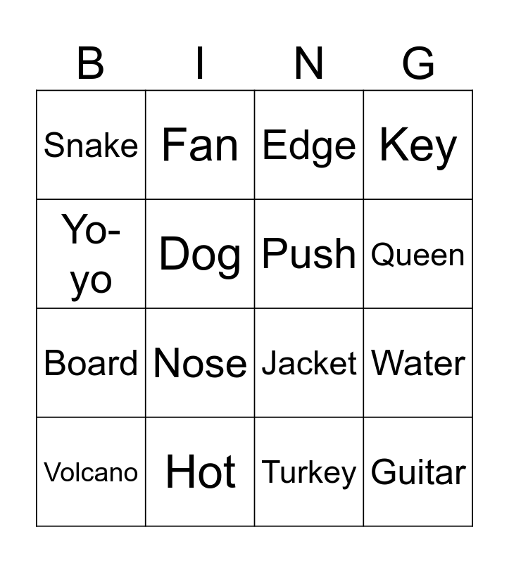 This bingo card has 27 words: Free!, Apple, Board, Cat, Dog, Edge, Fan, Guitar, Hot, Insect, Jacket, Key, Lamp, Milk, Nose, Octopus, Push, Queen, Rainbow, Snake, Turkey, Umbrella, Water, Volcano, X-ray box, Yo-yo and Zoo.