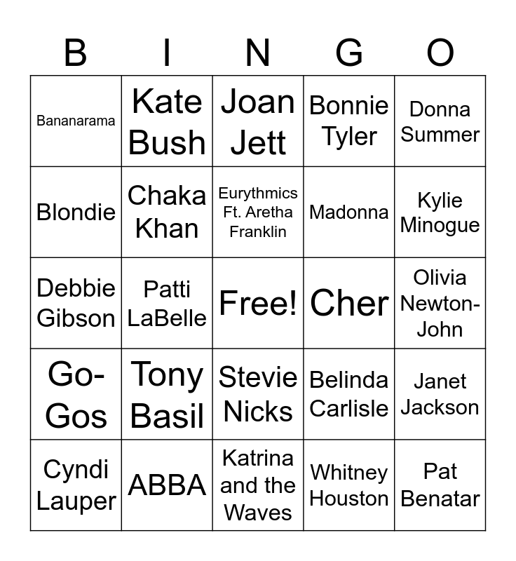 This bingo card has a free space and 28 words: Janet Jackson, Tina Turner, Madonna, Whitney Houston, Blondie, Joan Jett, Kate Bush, Go-Gos, Cher, Cyndi Lauper, Debbie Gibson, Bonnie Tyler, ABBA, Katrina and the Waves, Kylie Minogue, Weather Girls, Tony Basil, Chaka Khan, Eurythmics Ft. Aretha Franklin, Stevie Nicks, Bananarama, Dolly Parton, Pat Benatar, Patti LaBelle, Olivia Newton-John, Belinda Carlisle, Donna Summer and Paula Abdul.