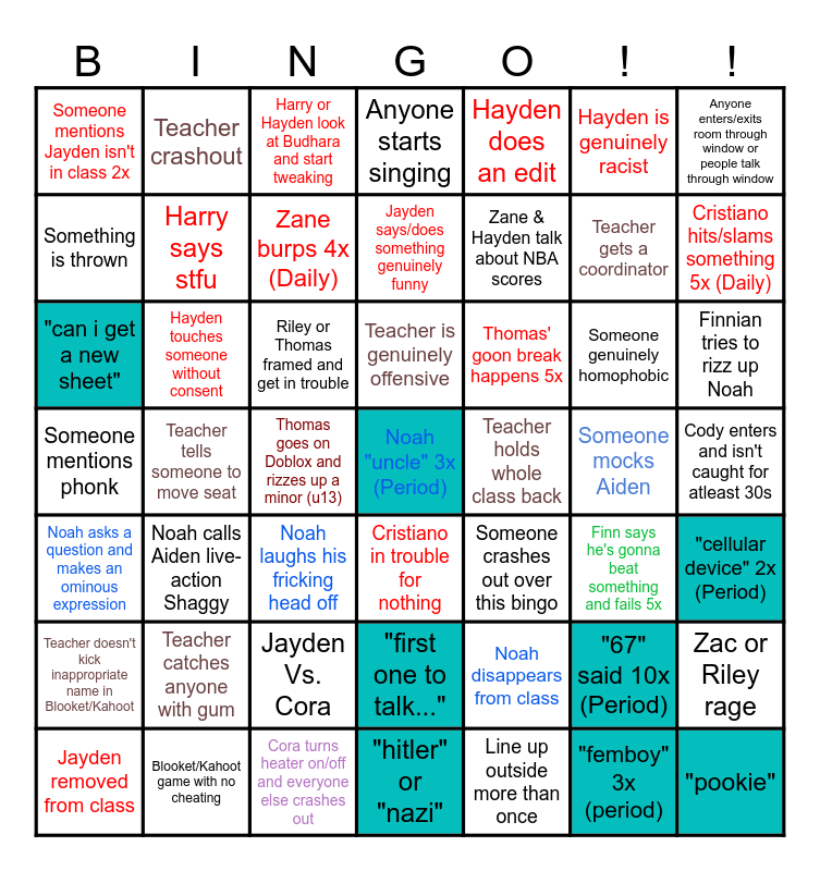 This bingo card has 49 words: "67" said 10x (Period), Teacher gets a coordinator, Line up outside more than once, Teacher tells someone to move seat, Riley or Thomas framed and get in trouble, Cody enters and isn't caught for atleast 30s, Teacher crashout, Cora turns heater on/off and everyone else crashes out, Hayden is genuinely racist, Cristiano in trouble for nothing, Anyone enters/exits room through window or people talk through window, Anyone starts singing, Someone genuinely homophobic, Thomas' goon break happens 5x, Teacher catches anyone with gum, Someone mocks Aiden, Something is thrown, Cristiano hits/slams something 5x (Daily), Zac or Riley rage, Hayden does an edit, Zane & Hayden talk about NBA scores, Thomas goes on Doblox and rizzes up a minor (u13), Someone mentions Jayden isn't in class 2x, Harry says stfu, Jayden removed from class, Zane burps 4x (Daily), Finnian tries to rizz up Noah, Blooket/Kahoot game with no cheating, Teacher is genuinely offensive, Hayden touches someone without consent, "pookie", Teacher holds whole class back, Teacher doesn't kick inappropriate name in Blooket/Kahoot, Jayden Vs. Cora, Someone mentions phonk, Someone crashes out over this bingo, Finn says he's gonna beat something and fails 5x, "cellular device" 2x (Period), "can i get a new sheet", Noah laughs his fricking head off, "first one to talk...", Noah asks a question and makes an ominous expression, Noah "uncle" 3x (Period), "hitler" or "nazi", Jayden says/does something genuinely funny, Harry or Hayden look at Budhara and start tweaking, Noah disappears from class, Noah calls Aiden live-action Shaggy and "femboy" 3x (period).