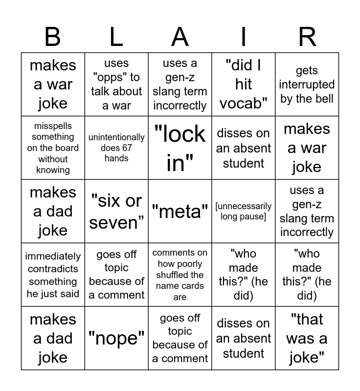 ⚠ This card has duplicate items: calls on someone without consulting the cards first (2), immediately contradicts something he just said (2), uses "opps" to talk about a war (2), disses on ms handelsman when talking about essay writing (2), comments on how poorly shuffled the name cards are (2), pontificates about sausage biscuits (2), "did I hit vocab" (2), says anything about florida (2), misspells something on the board without knowing (2), "interesting fun fact" (2), makes a war joke (2), "lock in" (2), makes a dad joke (2), unintentionally does 67 hands (2), goes off topic because of a comment (2), "that was a joke" (2), disses on an absent student (2), uses a gen-z slang term incorrectly (2), "who made this?" (he did) (2), makes a word pun (2), [unnecessarily long pause] (2), gets interrupted by the bell (2)