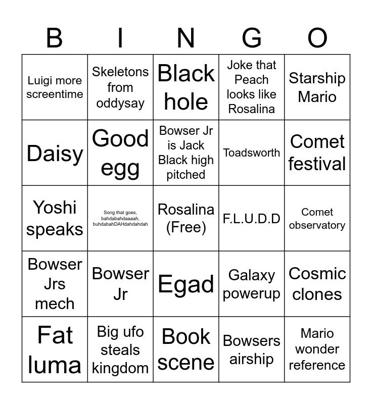 This bingo card has a free space and 24 words: Bowser Jr, Big ufo steals kingdom, Bowser Jr is Jack Black high pitched, Fat luma, Starship Mario, Luigi more screentime, Daisy, Skeletons from oddysay, F.L.U.D.D, Egad, Toadsworth, Yoshi speaks, Galaxy powerup, Cosmic clones, Good egg, Bowsers airship, Comet observatory, Black hole, Comet festival, Song that goes, bahdabahdaaaah, buhdabahDAHdahdahdah, Mario wonder reference, Bowser Jrs mech, Joke that Peach looks like Rosalina and Book scene.
