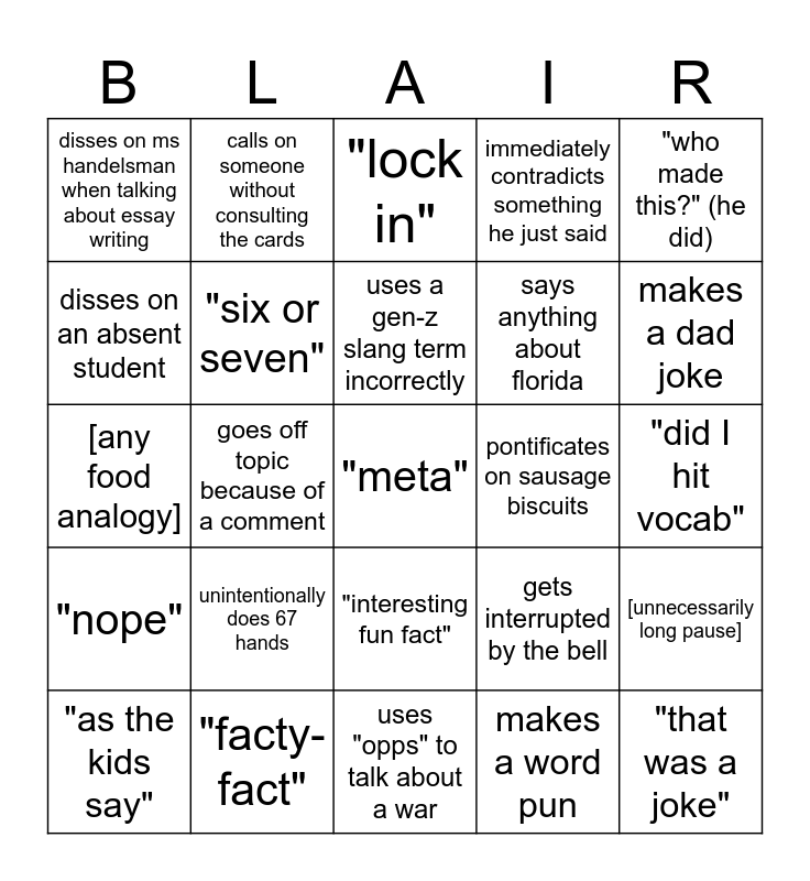This bingo card has a free space and 29 words: "as the kids say", "to get down with the kids", goes off topic because of a comment, marks a student tardy who was <1 min late to class, disses on ms handelsman when talking about essay writing, "lock in", "six or seven", unintentionally does 67 hands, pontificates on sausage biscuits, "facty-fact", "did I hit vocab", "that was a joke", uses "opps" to talk about a war, makes a word pun, makes a dad joke, makes a war joke, "interesting fun fact", "nope", "who made this?" (he did), [any food analogy], gets interrupted by the bell, comments on how poorly shuffled the name cards are, says anything about florida, disses on an absent student, immediately contradicts something he just said, calls on someone without consulting the cards, [unnecessarily long pause], uses a gen-z slang term incorrectly and misspells something on the board without knowing.