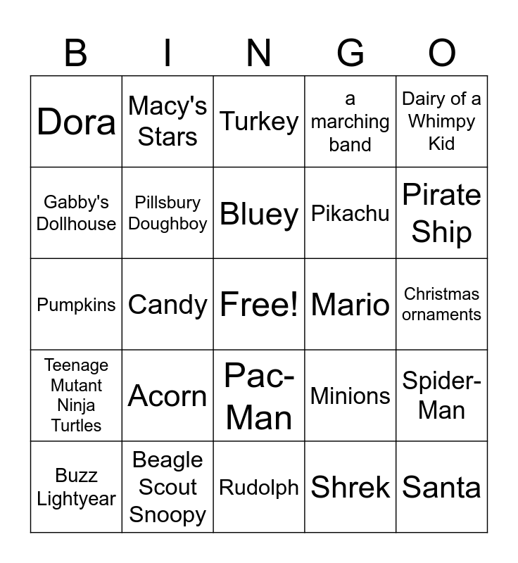 This bingo card has a free space and 24 words: Acorn, Beagle Scout Snoopy, Bluey, Buzz Lightyear, Dairy of a Whimpy Kid, Dora, Gabby's Dollhouse, Macy's Stars, Mario, Pac-Man, Pikachu, Pumpkins, Minions, Spider-Man, Pillsbury Doughboy, Shrek, Christmas ornaments, Turkey, Pirate Ship, Candy, Santa, Teenage Mutant Ninja Turtles, a marching band and Rudolph.