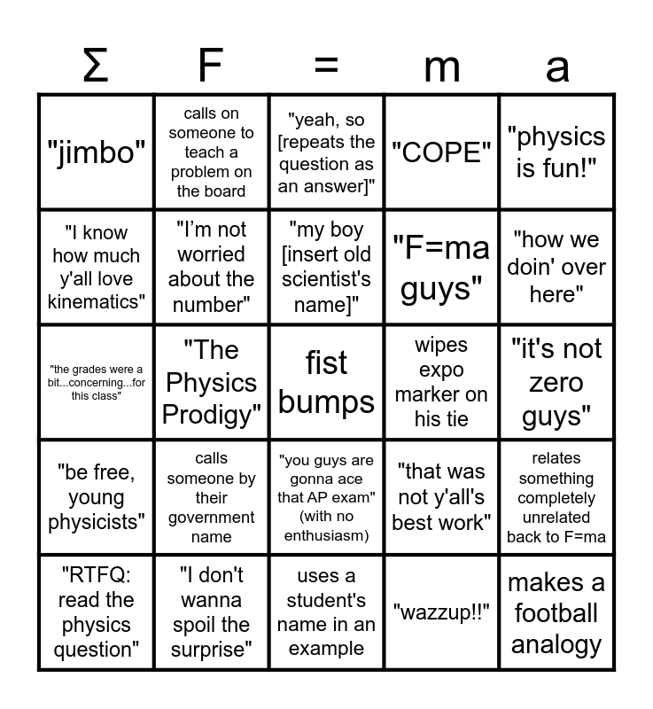 This bingo card has a free space and 29 words: "RTFQ: read the physics question", "are you guys awake or do y'all just not get it", "The Physics Prodigy", "little sophia", "jimbo", "yeah, so [repeats the question as an answer]", "I’m not worried about the number", calls someone by their government name, wipes expo marker on his tie, "I don't wanna spoil the surprise", "it's not zero guys", makes a football analogy, uses a student's name in an example, "wazzup!!", "how we doin' over here", "pursue excellence, don't do drugs...", "you guys are gonna ace that AP exam" (with no enthusiasm), "be free, young physicists", "physics is fun!", "the grades were a bit...concerning...for this class", "that was not y'all's best work", "what in the world is on your whiteboard", "F=ma guys", "I know how much y'all love kinematics", "COPE", calls on someone to teach a problem on the board, relates something completely unrelated back to F=ma, "my boy [insert old scientist's name]" and gives an old scientist a funny nickname.