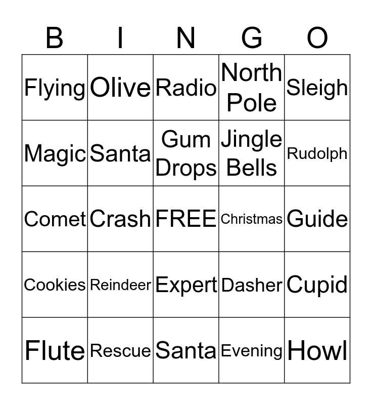 This bingo card has a free space and 24 words: Reindeer, Rescue, Gum Drops, Flute, Sleigh, Flying, Magic, Olive, Christmas, Expert, Jingle Bells, Comet, Dasher, Cupid, Santa, Evening, Guide, Radio, Rudolph, Crash, Howl, Cookies, North Pole and Santa.