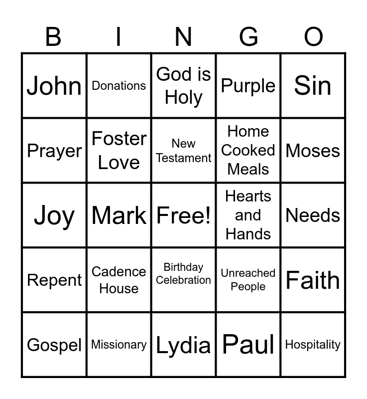 This bingo card has a free space and 29 words: Gospel, Matthew, Mark, Luke, John, God is Holy, Foster Love, Cadence House, Hearts and Hands, Missionary, Needs, Hospitality, Lydia, Paul, Moses, Food Insecurity, Birthday Celebration, Repent, Sin, Joy, Unreached People, Bible, Home Cooked Meals, Prayer, Purple, Donations, Faith, New Testament and Old Testament.