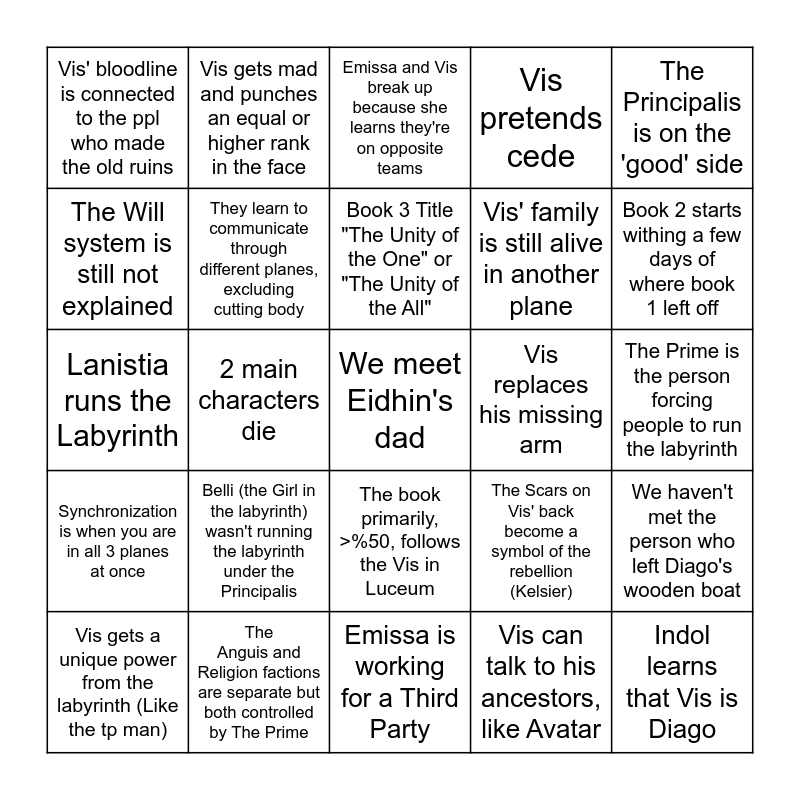This bingo card has 25 words: Belli (the Girl in the labyrinth) wasn't running the labyrinth under the Principalis, Emissa is working for a Third Party, Book 3 Title "The Unity of the One" or "The Unity of the All", Vis gets a unique power from the labyrinth (Like the tp man), The Principalis is on the 'good' side, Vis' bloodline is connected to the ppl who made the old ruins, The Will system is still not explained, Vis gets mad and punches an equal or higher rank in the face, Vis replaces his missing arm, The book primarily, >%50, follows the Vis in Luceum, Vis' family is still alive in another plane, Lanistia runs the Labyrinth, The Scars on Vis' back become a symbol of the rebellion (Kelsier), We haven't met the person who left Diago's wooden boat, They learn to communicate through different planes, excluding cutting body, Indol learns that Vis is Diago, The Prime is the person forcing people to run the labyrinth, Emissa and Vis break up because she learns they're on opposite teams, Book 2 starts withing a few days of where book 1 left off, 2 main characters die, We meet Eidhin's dad, The Anguis and Religion factions are separate but both controlled by The Prime, Synchronization is when you are in all 3 planes at once, Vis pretends cede and Vis can talk to his ancestors, like Avatar.