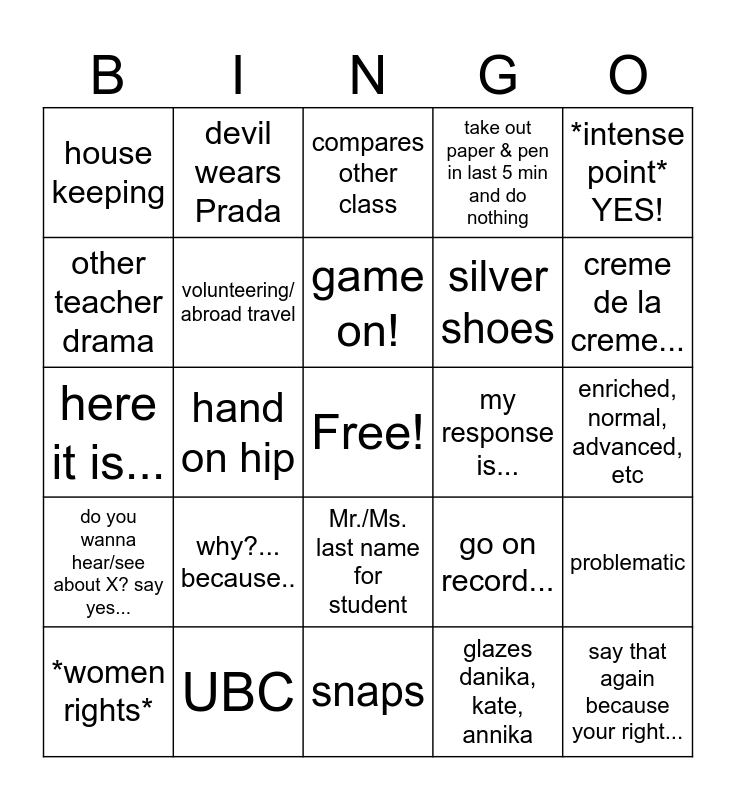 This bingo card has a free space and 24 words: why?... because.., UBC, game on!, *women rights*, *intense point* YES!, house keeping, other teacher drama, devil wears Prada, my response is..., Mr./Ms. last name for student, silver shoes, here it is..., go on record..., problematic, volunteering/ abroad travel, glazes danika, kate, annika, enriched, normal, advanced, etc, compares other class, creme de la creme..., hand on hip, say that again because your right..., do you wanna hear/see about X? say yes..., take out paper & pen in last 5 min and do nothing and snaps.
