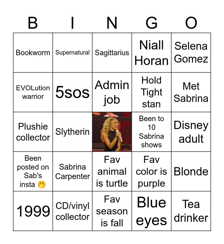 This bingo card has a free space and 24 words: 1999, Sabrina Carpenter, Admin job, Blue eyes, Selena Gomez, Bookworm, Supernatural, Sagittarius, Been to 10 Sabrina shows, Disney adult, Plushie collector, 5sos, Fav color is purple, Blonde, EVOLution warrior, CD/vinyl collector, Fav season is fall, Niall Horan, Met Sabrina, Been posted on Sab's insta 🤭, Slytherin, Fav animal is turtle, Hold Tight stan and Tea drinker.