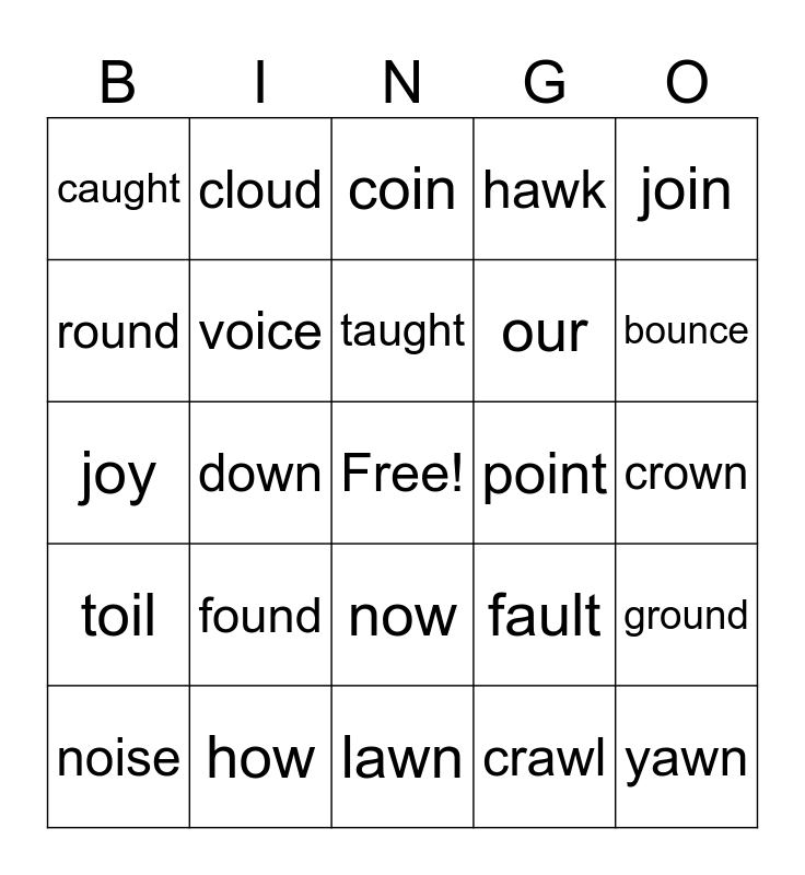 This bingo card has a free space and 36 words: cause, boy, choice, voice, fault, toil, taught, saw, join, brown, down, hawk, draw, point, bounce, caught, house, found, yawn, coin, crown, ground, how, noise, lawn, cloud, joy, pause, our, round, foil, toy, crawl, now, shout and claw.