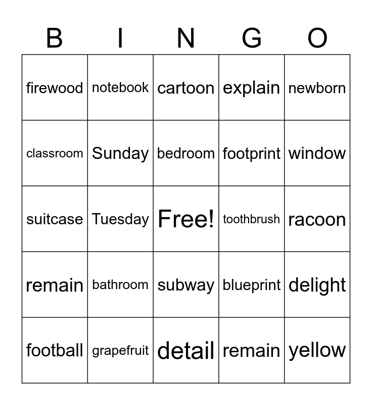 This bingo card has a free space and 24 words: bathroom, grapefruit, bedroom, football, newborn, firewood, classroom, notebook, toothbrush, subway, footprint, suitcase, blueprint, delight, Sunday, remain, racoon, cartoon, window, Tuesday, yellow, remain, explain and detail.