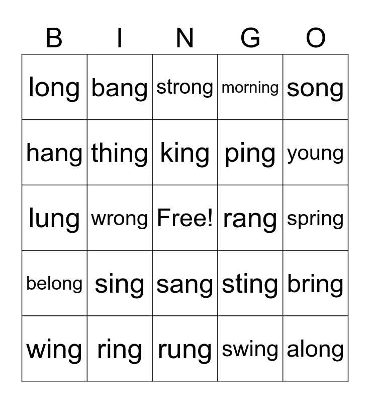 This bingo card has a free space and 24 words: sing, ring, king, wing, song, long, hang, bang, rang, sang, ping, lung, sting, bring, thing, swing, spring, strong, young, wrong, along, belong, morning and rung.