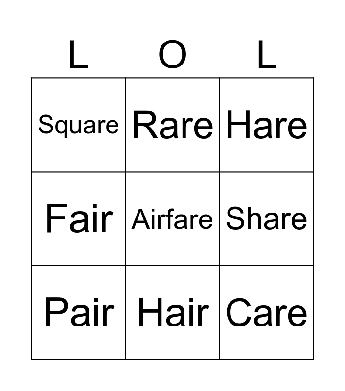 This bingo card has a free space and 10 words: Hair, Hare, Square, Care, Fair, Pair, Rare, Chair, Share and Airline.