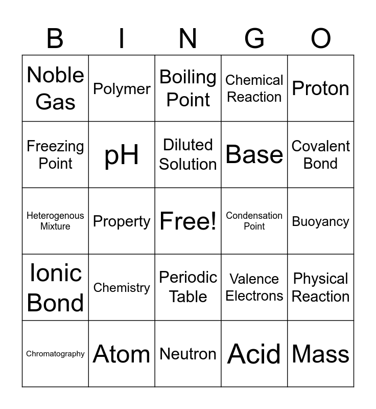 This bingo card has a free space and 30 words: Atom, Electron, Property, Homogenous Mixture, Noble Gas, Boiling Point, pH, Periodic Table, Condensation Point, Neutron, Buoyancy, Mass, Acid, Melting Point, Covalent Bond, Crystal, Valence Electrons, Ionic Bond, Chemistry, Proton, Heterogenous Mixture, Volume, Polymer, Base, Freezing Point, Chemical Reaction, Physical Reaction, Chromatography, Diluted Solution and Saturated Solution.