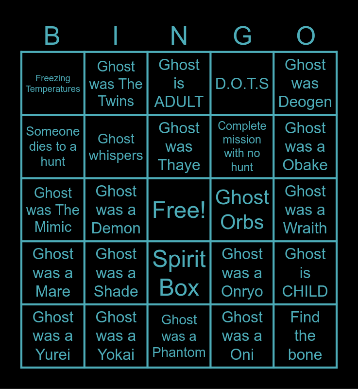 This bingo card has a free space and 40 words: GH Dies, Ghost was The Mimic, Fingerprints, Ghost whispers, Ghost was a Yokai, Spirit Box, Ghost was Thaye, EMF, Ghost was Deogen, Ghost was a Mare, Ghost was a Demon, D.O.T.S, Find the bone, Ghost was a Wraith, Ghost Orbs, Ghost was a Shade, Ghost Writing, Freezing Temperatures, Ghost knocked something around, Ghost is ADULT, Ghost is CHILD, Ghost was a Oni, Complete mission with no hunt, Someone dies to a hunt, Ghost was a Spirit, Ghost was a Poltergeist, Ghost was a Myling, Ghost was a Raiju, Ghost was a Moroi, Ghost was a Banshee, Ghost was a Revenant, Ghost was a Yurei, Ghost was a Hantu, Ghost was a Onryo, Ghost was a Obake, Ghost was a Phantom, Ghost was a Jinn, Ghost was a Goryo, Ghost was The Twins and Ghost Photo.