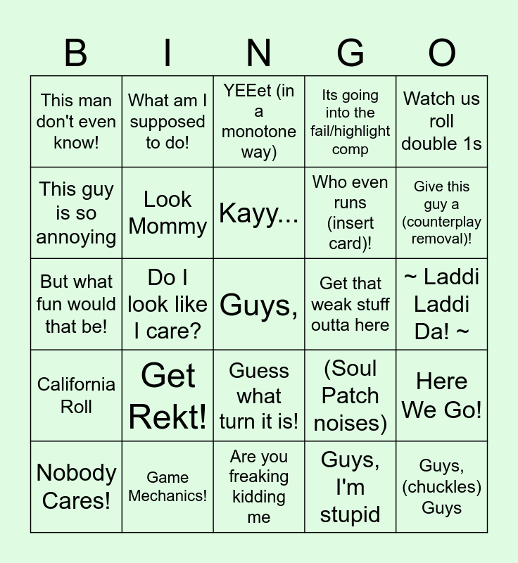 This bingo card has a free space and 24 words: Get Rekt!, Game Mechanics!, Kayy..., Nobody Cares!, Watch us roll double 1s, This man don't even know!, This guy is so annoying, What am I supposed to do!, Get that weak stuff outta here, Guess what turn it is!, Who even runs (insert card)!, But what fun would that be!, (Soul Patch noises), Here We Go!, Look Mommy, Guys, I'm stupid, ~ Laddi Laddi Da! ~, YEEet (in a monotone way), Give this guy a (counterplay removal)!, Do I look like I care?, Guys, (chuckles) Guys, California Roll, Its going into the fail/highlight comp and Are you freaking kidding me.