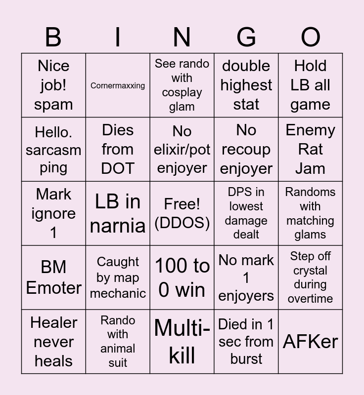 This bingo card has a free space and 24 words: Caught by map mechanic, Rando with animal suit, No elixir/pot enjoyer, Healer never heals, Hold LB all game, Nice job! spam, Hello. sarcasm ping, Cornermaxxing, DPS in lowest damage dealt, 100 to 0 win, No recoup enjoyer, Mark ignore 1, No mark 1 enjoyers, Step off crystal during overtime, Dies from DOT, Died in 1 sec from burst, Randoms with matching glams, See rando with cosplay glam, Enemy Rat Jam, LB in narnia, AFKer, BM Emoter, double highest stat and Multi-kill.