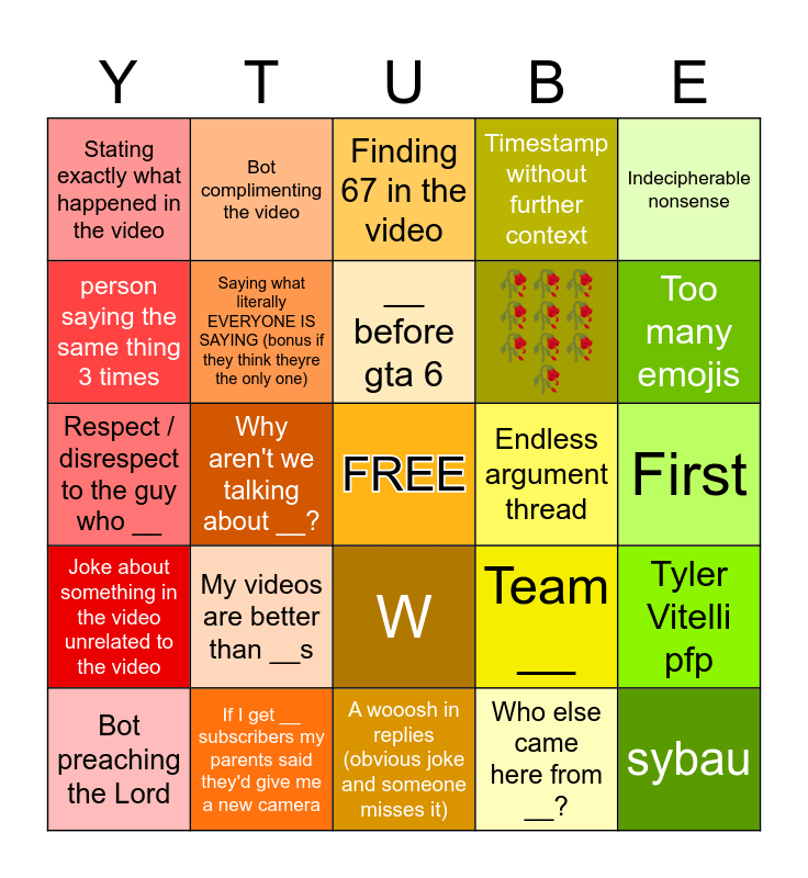 This bingo card has a free space and 24 words: Bot preaching the Lord, My videos are better than __s, __ before gta 6, Who else came here from __?, Indecipherable nonsense, Stating exactly what happened in the video, Bot complimenting the video, Finding 67 in the video, Endless argument thread, First, Respect / disrespect to the guy who __, Saying what literally EVERYONE IS SAYING (bonus if they think theyre the only one), Team __, Tyler Vitelli pfp, person saying the same thing 3 times, If I get __ subscribers my parents said they'd give me a new camera, A wooosh in replies (obvious joke and someone misses it), Timestamp without further context, Too many emojis, Joke about something in the video unrelated to the video, Why aren't we talking about __?, W, 🥀🥀🥀🥀🥀🥀🥀🥀🥀🥀 and sybau.