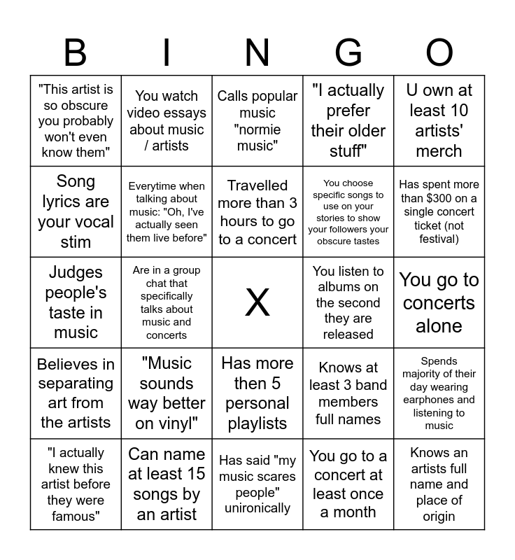 This bingo card has a free space and 24 words: "Music sounds way better on vinyl", Can name at least 15 songs by an artist, Travelled more than 3 hours to go to a concert, "I actually knew this artist before they were famous", U own at least 10 artists' merch, "This artist is so obscure you probably won't even know them", Song lyrics are your vocal stim, You watch video essays about music / artists, You listen to albums on the second they are released, Has more then 5 personal playlists, You choose specific songs to use on your stories to show your followers your obscure tastes, Judges people's taste in music, Knows at least 3 band members full names, Spends majority of their day wearing earphones and listening to music, Everytime when talking about music: "Oh, I've actually seen them live before", You go to a concert at least once a month, You go to concerts alone, Calls popular music "normie music", Has spent more than $300 on a single concert ticket (not festival), Are in a group chat that specifically talks about music and concerts, Knows an artists full name and place of origin, Believes in separating art from the artists, "I actually prefer their older stuff" and Has said "my music scares people" unironically.
