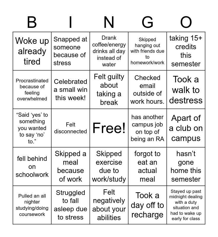 This bingo card has a free space and 24 words: Skipped a meal because of work, Struggled to fall asleep due to stress, Felt guilty about taking a break, Pulled an all nighter studying/doing coursework, taking 15+ credits this semester, Woke up already tired, Procrastinated because of feeling overwhelmed, Snapped at someone because of stress, has another campus job on top of being an RA, Skipped exercise due to work/study, Checked email outside of work hours., “Said ‘yes’ to something you wanted to say ‘no’ to.”, forgot to eat an actual meal, hasn’t gone home this semester, Celebrated a small win this week!, Took a day off to recharge, Apart of a club on campus, Drank coffee/energy drinks all day instead of water, Took a walk to destress, Felt disconnected, Stayed up past midnight dealing with a duty situation and had to wake up early for class, fell behind on schoolwork, Skipped hanging out with friends due to homework/work and Felt negatively about your abilities.