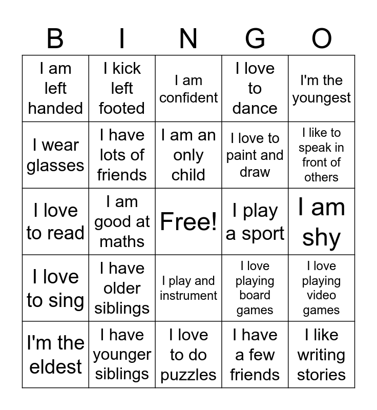 This bingo card has a free space and 24 words: I have older siblings, I have younger siblings, I am an only child, I'm the eldest, I'm the youngest, I am left handed, I wear glasses, I kick left footed, I play a sport, I play and instrument, I love to paint and draw, I love to read, I love playing board games, I love playing video games, I have lots of friends, I have a few friends, I am shy, I am confident, I like to speak in front of others, I am good at maths, I like writing stories, I love to sing, I love to dance and I love to do puzzles.