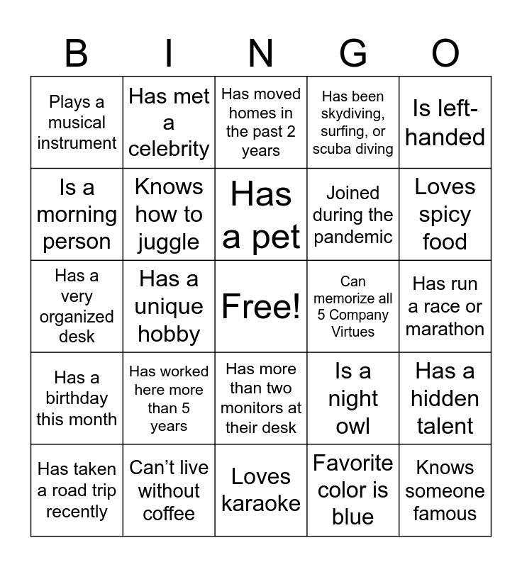 This bingo card has a free space and 24 words: Has worked here more than 5 years, Can’t live without coffee, Has a pet, Has taken a road trip recently, Is left-handed, Plays a musical instrument, Is a morning person, Has met a celebrity, Can memorize all 5 Company Virtues, Has more than two monitors at their desk, Joined during the pandemic, Has a very organized desk, Is a night owl, Has a hidden talent, Knows how to juggle, Favorite color is blue, Has run a race or marathon, Has moved homes in the past 2 years, Loves spicy food, Has a unique hobby, Knows someone famous, Has a birthday this month, Has been skydiving, surfing, or scuba diving and Loves karaoke.