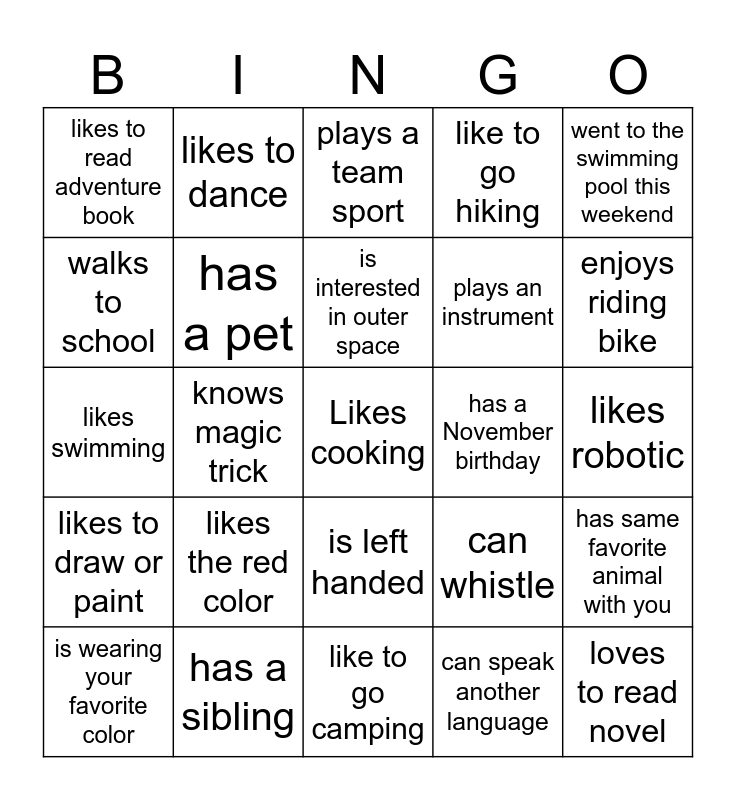 This bingo card has a free space and 24 words: likes the red color, has a sibling, is interested in outer space, is wearing your favorite color, went to the swimming pool this weekend, likes to read adventure book, walks to school, likes to dance, has a November birthday, is left handed, plays an instrument, likes swimming, can whistle, has same favorite animal with you, has a pet, can speak another language, likes robotic, plays a team sport, enjoys riding bike, knows magic trick, loves to read novel, likes to draw or paint, like to go hiking and like to go camping.