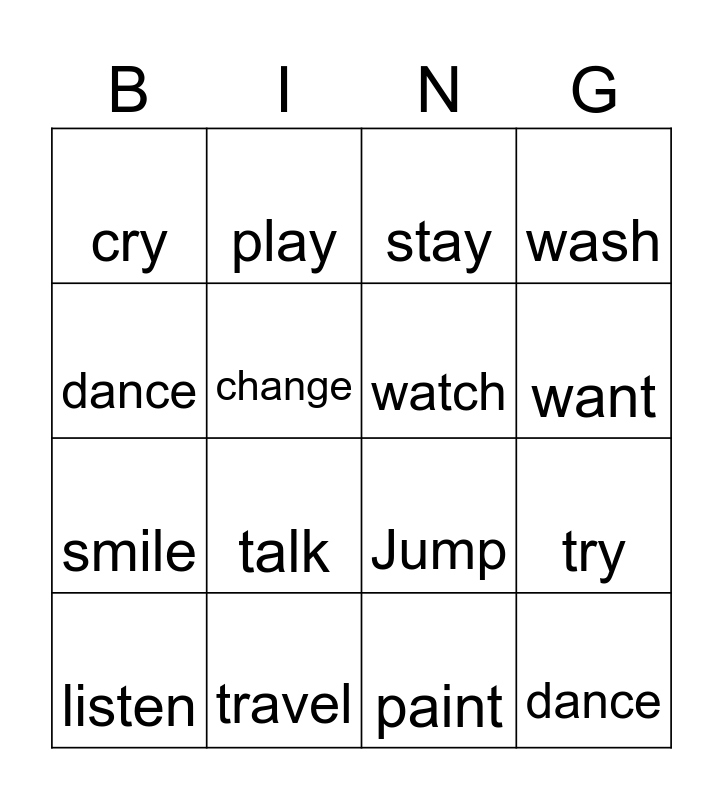 This bingo card has 25 words: OPEN, stop, want, work, dance, cry, change, play, travel, cook, smile, Jump, listen, walk, watch, visit, paint, stay, talk, try, listen, help, dance, wash and jump.