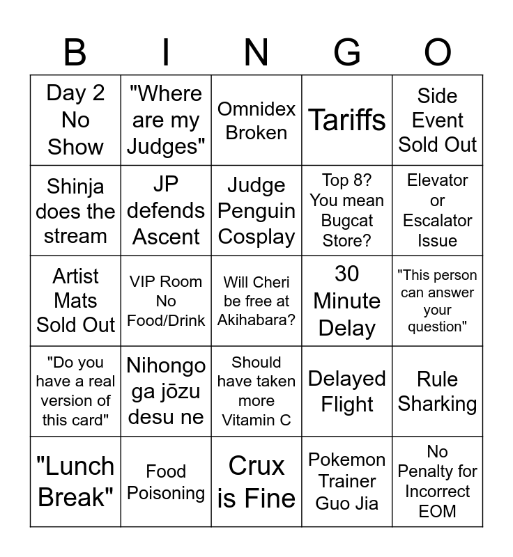 This bingo card has a free space and 24 words: "Lunch Break", Nihongo ga jōzu desu ne, Judge Penguin Cosplay, Pokemon Trainer Guo Jia, Side Event Sold Out, Day 2 No Show, "Where are my Judges", Omnidex Broken, 30 Minute Delay, "This person can answer your question", Artist Mats Sold Out, JP defends Ascent, Delayed Flight, Rule Sharking, Shinja does the stream, Food Poisoning, Crux is Fine, Tariffs, Elevator or Escalator Issue, "Do you have a real version of this card", VIP Room No Food/Drink, Should have taken more Vitamin C, Top 8? You mean Bugcat Store? and No Penalty for Incorrect EOM.