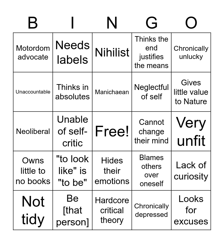 This bingo card has a free space and 24 words: "to look like" is "to be", Be [that person], Manichaean, Not tidy, Chronically unlucky, Motordom advocate, Unaccountable, Needs labels, Cannot change their mind, Hides their emotions, Neglectful of self, Neoliberal, Blames others over oneself, Lack of curiosity, Thinks in absolutes, Chronically depressed, Very unfit, Nihilist, Gives little value to Nature, Unable of self-critic, Looks for excuses, Owns little to no books, Thinks the end justifies the means and Hardcore critical theory.