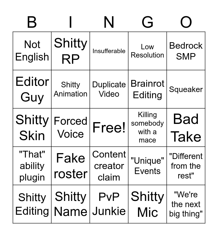 This bingo card has a free space and 24 words: Fake roster, Shitty Name, Duplicate Video, Shitty Editing, Bedrock SMP, Not English, Editor Guy, Shitty RP, Killing somebody with a mace, Content creator claim, Brainrot Editing, Shitty Skin, "Unique" Events, "Different from the rest", Shitty Animation, Shitty Mic, Bad Take, Insufferable, Squeaker, Forced Voice, "We're the next big thing", "That" ability plugin, Low Resolution and PvP Junkie.