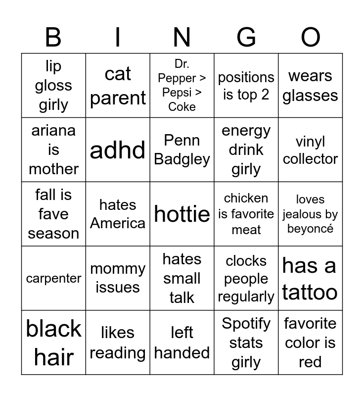 This bingo card has a free space and 25 words: mommy issues, left handed, Penn Badgley, black hair, wears glasses, lip gloss girly, ariana is mother, cat parent, chicken is favorite meat, hates small talk, energy drink girly, fall is fave season, clocks people regularly, has a tattoo, adhd, always tired, loves jealous by beyoncé, Dr. Pepper > Pepsi > Coke, vinyl collector, hates America, favorite color is red, likes reading, carpenter, positions is top 2 and Spotify stats girly.