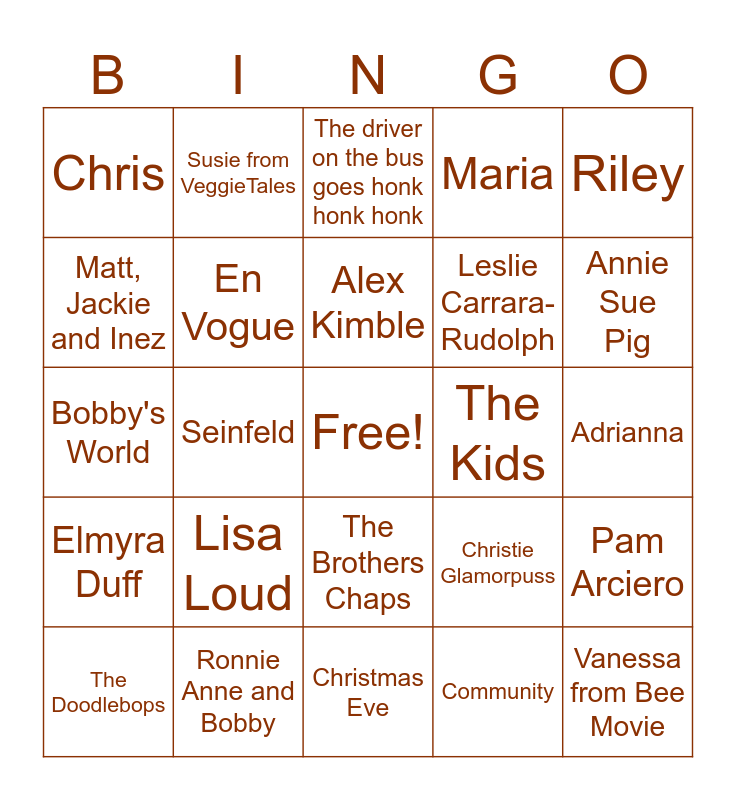 This bingo card has a free space and 99 words: Suzi Shelton, Lori and Leni, Corner Gas, The driver on the bus goes honk honk honk, Lori Loud, Gabi and Miles, Kari, Janice, Two and a Half Men, Edna Krabappel, Ted Harris, Stephanie and Sportacus, Anything Muppets, The Brothers Chaps, Ronnie Anne and Sid Chang, Chris, Susie from VeggieTales, Round and round, Gary and Mary, Harry's Mom, Wayne and Wanda, Lucy Loud, Any Disney Princesses, The Pointer Sisters, Lola Loud, Pam Arciero, Alex Kimble, Luan Loud, The four girls, Gina, Christmas Eve, Community, Lynn Loud, Roberta, Seinfeld, Bobby's World, Lori and Leni, George Sr. and Mary, Kids from Barney and Friends, Lisa Loud, Penny and Sheldon, Annie Sue Pig, Maria, Ronnie Anne and Bobby, Spamela Hamderson, Leni Loud, Debra, Trixie Tang and Veronica, Pooby, Mando, Luna Loud, Vanessa from Bee Movie, Christie Glamorpuss, Mercedes, Kyle Wilkinson, Gina and Jimmy, Kari, Maria Santiago, Laura, Lana Loud, Cheryl and Meryl, Liam Hunnicutt and Stella Zhau, Woody and Bo Peep, Dominique, Krista and Maggie, Timmy's Mom, Riley, Stephanie D'Abruzzo, Sesame Street Live purple skirt girl, Nick and Sally, Elmyra Duff, Sofia and Baileywick, Leslie Carrara-Rudolph, Matt, Jackie and Inez, The Dirt Sisters, Laurie Berkner, Denise Nickerson getting romantic with her two boyfriends, Skip Hinnant and Luis Avalos, En Vogue, Princess Fiona, Prairie Dawn, The Fresh Beat Band, The Kids, Butch Hartman, Elizabeth Banks, Leela, Logan, Logan and Chilly, The Puzzle Place, Joe and Steve, Adrianna, The Doodlebops, Hi-5, Cindy Vortex, Luis and Maria, Linda Flynn-Fletcher, Daniel Thrasher, Princess Amber, Gabi, Little People (Sarah Lynn, maybe?) and Frankie Foster.
