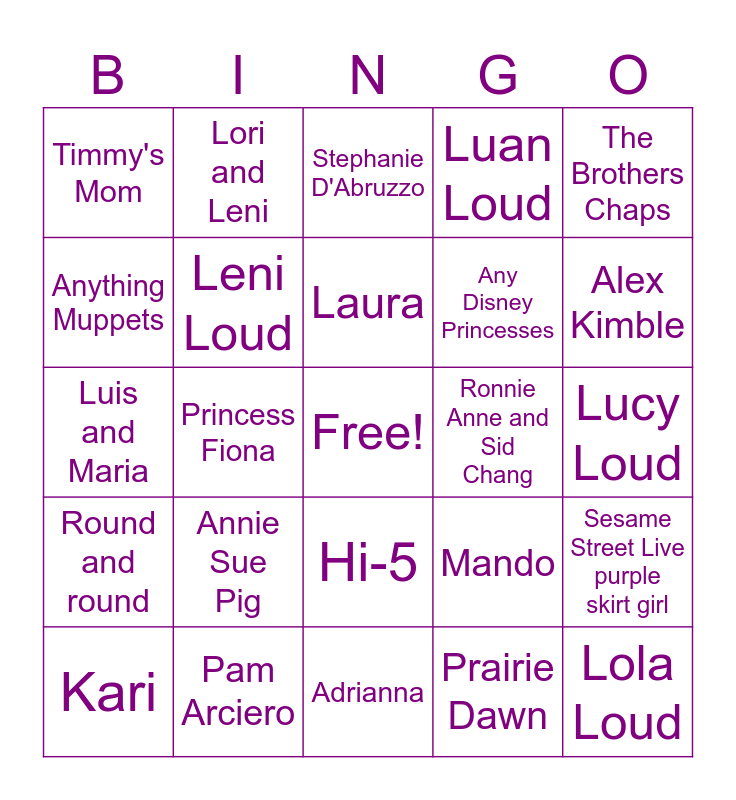 This bingo card has a free space and 100 words: Lori and Leni, Christmas Eve, Lucy Loud, Little People (Sarah Lynn, maybe?), The Fresh Beat Band, Vanessa from Bee Movie, Lori Loud, Riley, Liam Hunnicutt and Stella Zhau, Woody and Bo Peep, Lana Loud, Elmyra Duff, Princess Amber, Pam Arciero, Trixie Tang and Veronica, Cindy Vortex, Any Disney Princesses, Seinfeld, The Dirt Sisters, Cheryl and Meryl, Corner Gas, George Sr. and Mary, The four girls, Ronnie Anne and Bobby, The Kids, Ronnie Anne and Sid Chang, The Brothers Chaps, Mando, Gabi and Miles, Debra, Princess Fiona, Timmy's Mom, Maria, Joe and Steve, Prairie Dawn, Laura, Sesame Street Live purple skirt girl, Mercedes, Spamela Hamderson, Kids from Barney and Friends, Leslie Carrara-Rudolph, Bobby's World, Luis and Maria, The Puzzle Place, Alex Kimble, Stephanie D'Abruzzo, Logan, Suzi Shelton, Gabi, Adrianna, Matt, Jackie and Inez, The Doodlebops, Penny Proud, Denise Nickerson getting romantic with her two boyfriends, Skip Hinnant and Luis Avalos, Chris, Stephanie and Sportacus, Penny and Sheldon, Roberta, Wayne and Wanda, Luan Loud, Butch Hartman, Frankie Foster, Sofia and Baileywick, Leela, Maria Santiago, Dominique, Krista and Maggie, Lisa Loud, Elizabeth Banks, Two and a Half Men, Community, Pooby, Annie Sue Pig, Edna Krabappel, Laurie Berkner, The Pointer Sisters, Harry's Mom, Kari, Anything Muppets, Lynn Loud, Luna Loud, Gina, Lola Loud, Christie Glamorpuss, Hi-5, Logan and Chilly, Lori and Leni, Gina and Jimmy, Kyle Wilkinson, En Vogue, Round and round, Susie from VeggieTales, Nick and Sally, Daniel Thrasher, Kari, Leni Loud, Janice, The driver on the bus goes honk honk honk, Ted Harris, Gary and Mary and Linda Flynn-Fletcher.