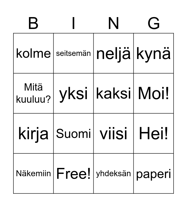 This bingo card has 22 words: Free!, kuusi, seitsemän, kahdeksan, yksi, kaksi, kolme, neljä, viisi, paperi, kirja, kynä, oppilas, Ole hyvä!, yhdeksän, kymmenen, Hei!, Näkemiin, Suomi, Mitä kuuluu?, Moi! and Hyvää huomenta.
