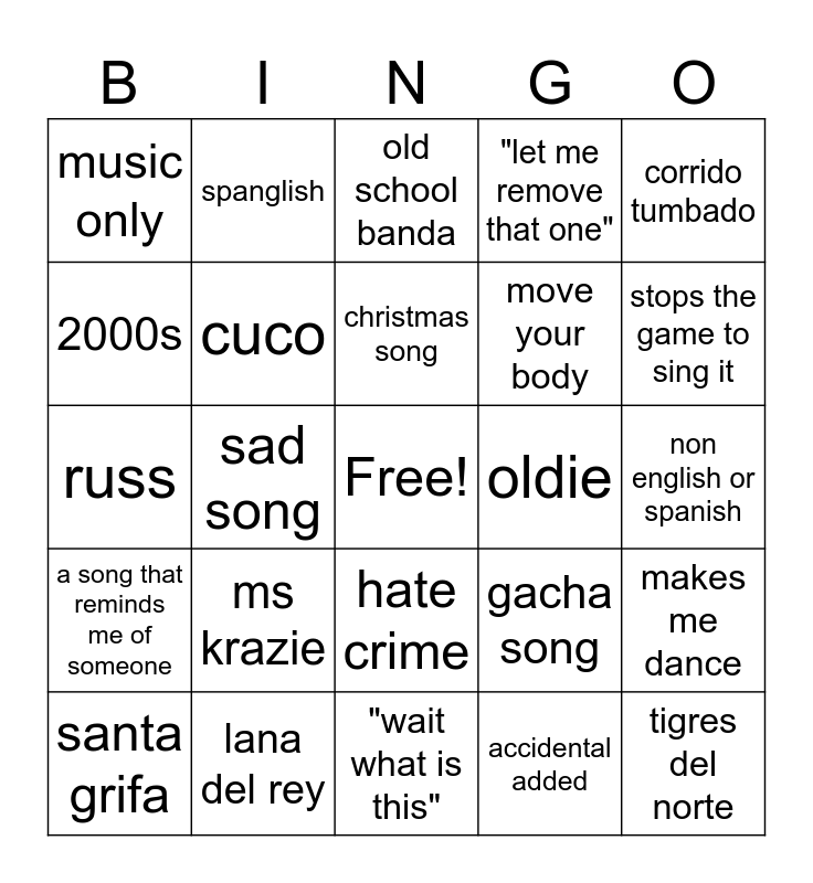 This bingo card has a free space and 24 words: santa grifa, ms krazie, christmas song, accidental added, corrido tumbado, music only, spanglish, old school banda, oldie, non english or spanish, russ, cuco, gacha song, makes me dance, 2000s, lana del rey, "wait what is this", "let me remove that one", stops the game to sing it, a song that reminds me of someone, sad song, hate crime, move your body and tigres del norte.