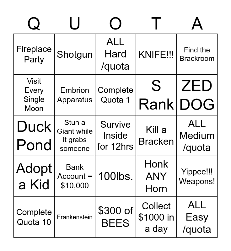 This bingo card has 25 words: Bank Account = $10,000, $300 of BEES, Complete Quota 1, Complete Quota 10, Find the Brackroom, Fireplace Party, Visit Every Single Moon, Shotgun, Kill a Bracken, 100lbs., S Rank, Duck Pond, Honk ANY Horn, Yippee!!! Weapons!, Embrion Apparatus, ALL Easy /quota, ALL Medium /quota, ALL Hard /quota, ZED DOG, Stun a Giant while it grabs someone, Survive Inside for 12hrs, Frankenstein, Adopt a Kid, KNIFE!!! and Collect $1000 in a day.