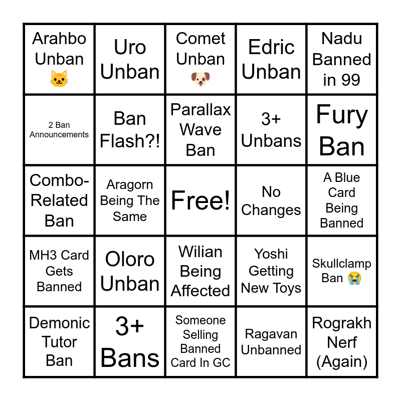 This bingo card has a free space and 24 words: Oloro Unban, 3+ Bans, Parallax Wave Ban, Demonic Tutor Ban, Nadu Banned in 99, Arahbo Unban 🐱, 2 Ban Announcements, Uro Unban, No Changes, Wilian Being Affected, 3+ Unbans, Combo-Related Ban, Yoshi Getting New Toys, Skullclamp Ban 😭, Ban Flash?!, Ragavan Unbanned, A Blue Card Being Banned, Comet Unban 🐶, Fury Ban, Aragorn Being The Same, Rograkh Nerf (Again), MH3 Card Gets Banned, Edric Unban and Someone Selling Banned Card In GC.
