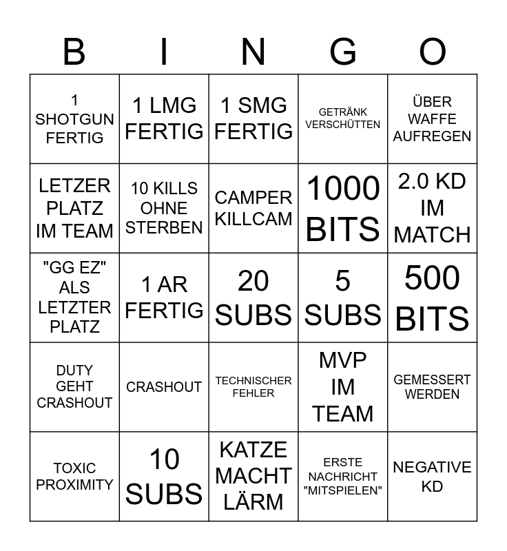 This bingo card has a free space and 24 words: CRASHOUT, 10 SUBS, CAMPER KILLCAM, TOXIC PROXIMITY, ÜBER WAFFE AUFREGEN, 1 SHOTGUN FERTIG, LETZER PLATZ IM TEAM, 1 LMG FERTIG, 5 SUBS, TECHNISCHER FEHLER, 1000 BITS, "GG EZ" ALS LETZTER PLATZ, MVP IM TEAM, GEMESSERT WERDEN, 10 KILLS OHNE STERBEN, ERSTE NACHRICHT "MITSPIELEN", 500 BITS, 1 SMG FERTIG, 2.0 KD IM MATCH, 1 AR FERTIG, NEGATIVE KD, DUTY GEHT CRASHOUT, GETRÄNK VERSCHÜTTEN and KATZE MACHT LÄRM.