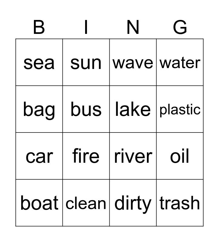 This bingo card has 40 words: Free!, river, ocean, lake, beach, fish, plastic, bottle, bag, trash, oil, water, boat, dirty, clean, factory, pipe, sea, sand, wave, bucket, smoke, car, bus, truck, sky, cloud, wind, tree, city, house, people, mask, smell, fire, dust, fog, street, sun and health.