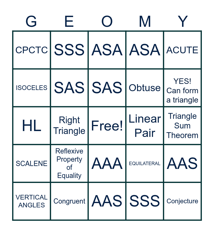 This bingo card has a free space and 29 words: VERTICAL ANGLES, Alternate Interior Angles, Right Triangle, CORRESPONDING ANGLES, CPCTC, ASA, SAS, Reflexive Property of Equality, Linear Pair, Congruent, Triangle Sum Theorem, Conjecture, AAS, SSS, YES! Can form a triangle, Angle Bisector, AAA, SCALENE, ACUTE, HL, EQUILATERAL, Perpendicular Bisector, Obtuse, ISOCELES, ASA, SSS, AAS, SAS and HL.