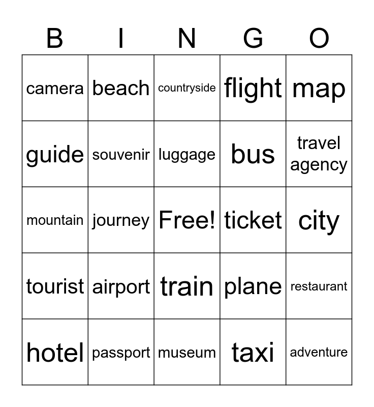 This bingo card has a free space and 24 words: airport, passport, luggage, hotel, map, camera, guide, beach, ticket, train, bus, mountain, plane, restaurant, souvenir, taxi, city, countryside, travel agency, journey, adventure, tourist, flight and museum.